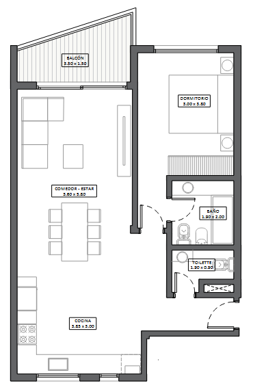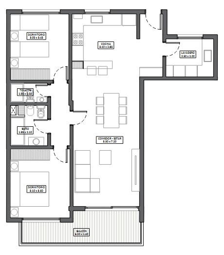 Cocina integrada al living comedor mediante barra desayunador, salida a balcón.
