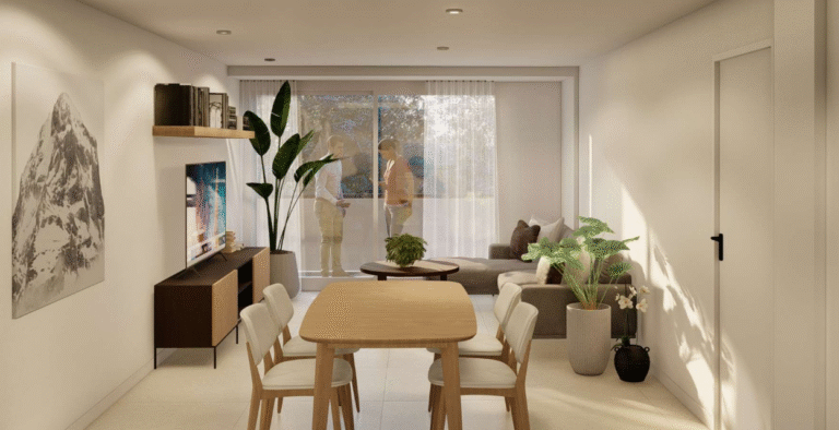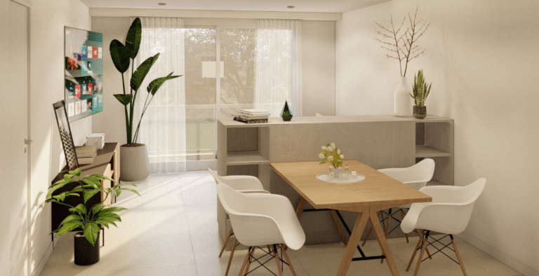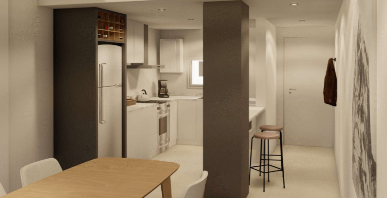 Cocina integrada al living comedor con barra desayunadora y salida a balcón.