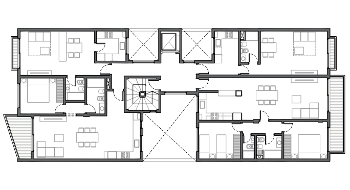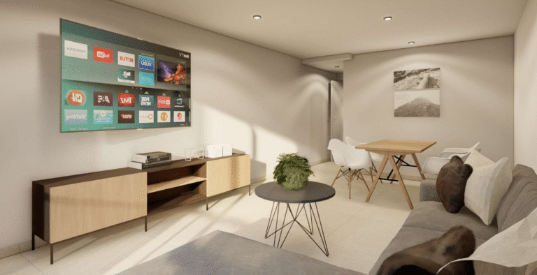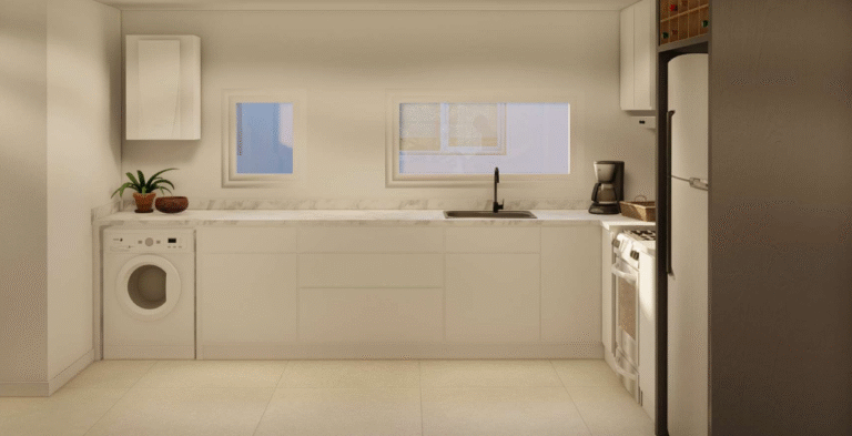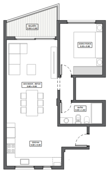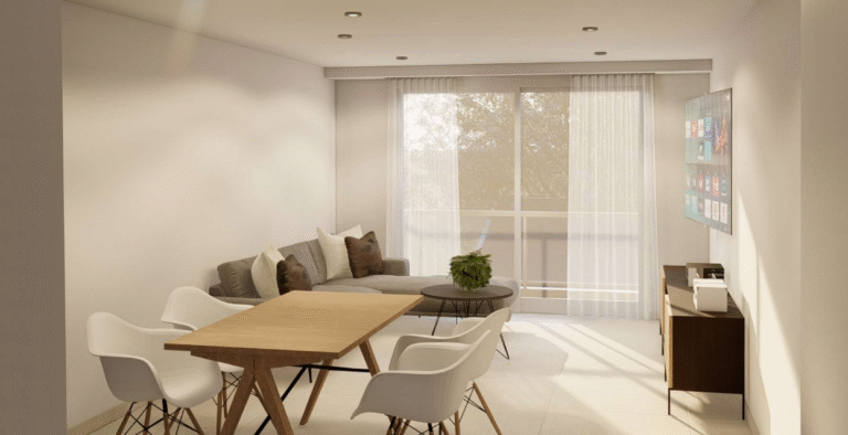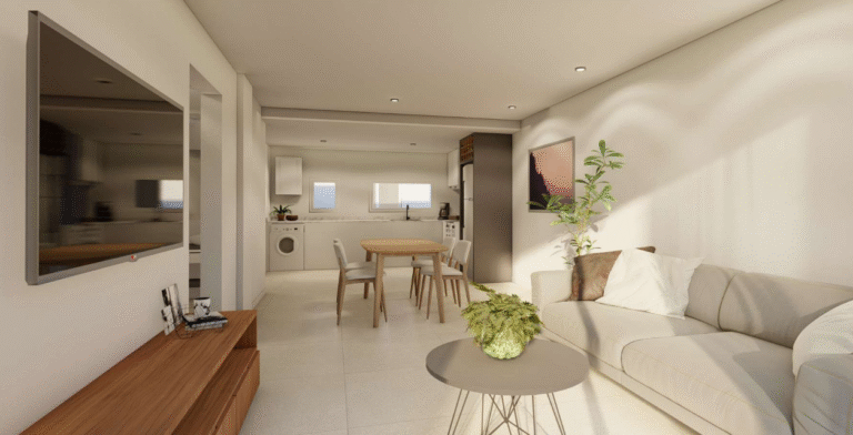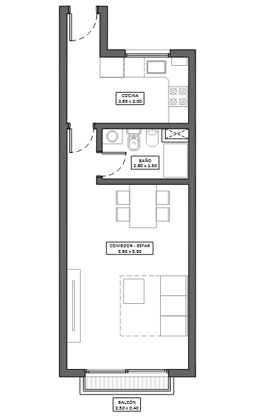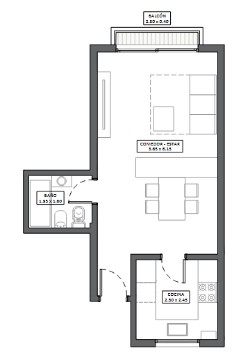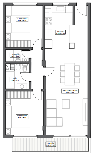 Cocina integrada al living comedor mediante barra desayunadora, salida a balcón.