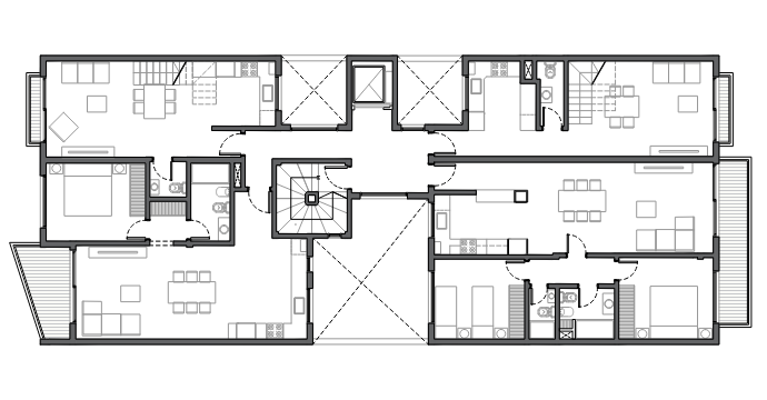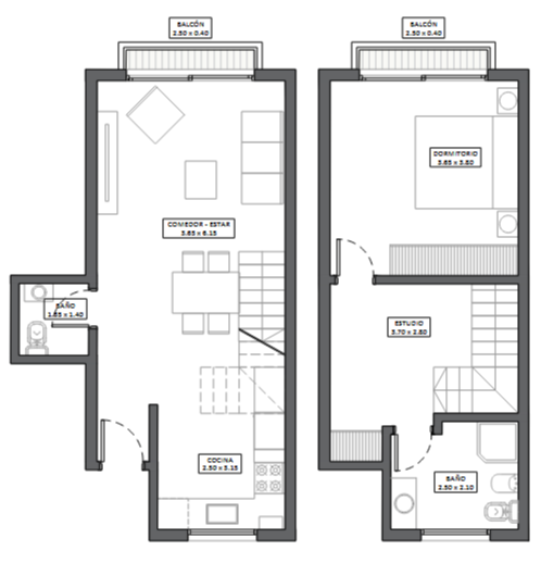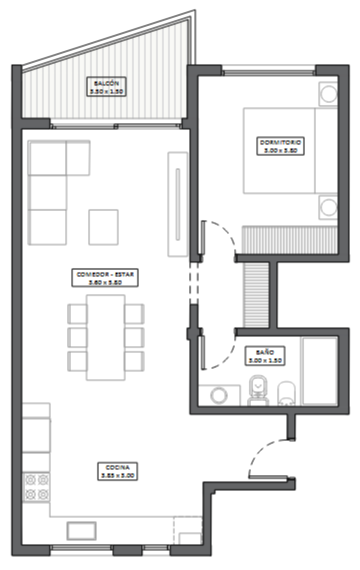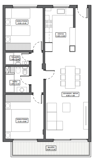 Cocina integrada al living comedor mediante barra desayunadora, salida a balcón.