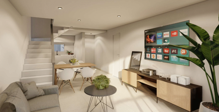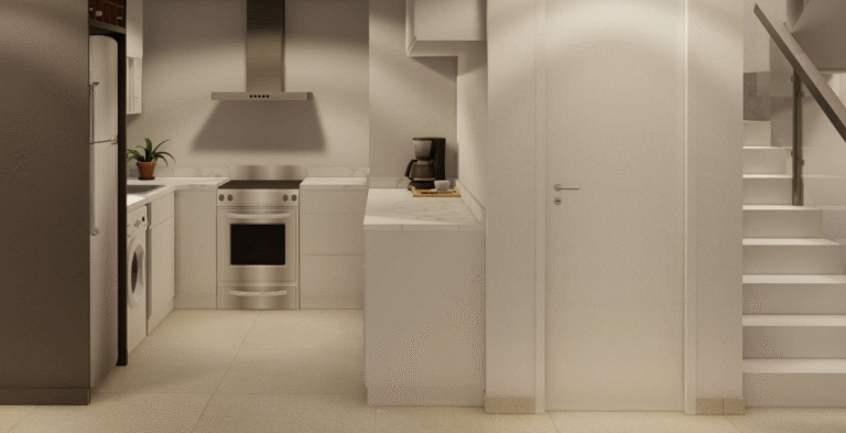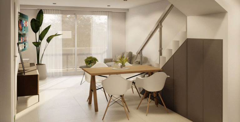 Cocina integrada al living comedor con barra desayunadora y salida a balcón.
